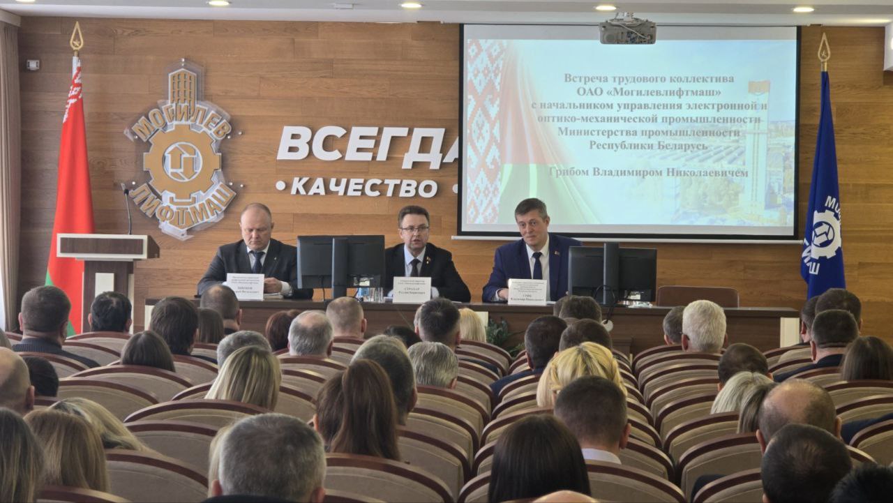 На Могилевлифтмаш состоялась информационная встреча, посвящённая теме «Обеспечение прозрачности в вопросах финансово-хозяйственной деятельности и социально-экономического прогресса предприятия» с участием Владимира Николаевича Гриба, начальника управления электронной и оптико-механической промышленности Министерства промышленности Республики Беларусь.