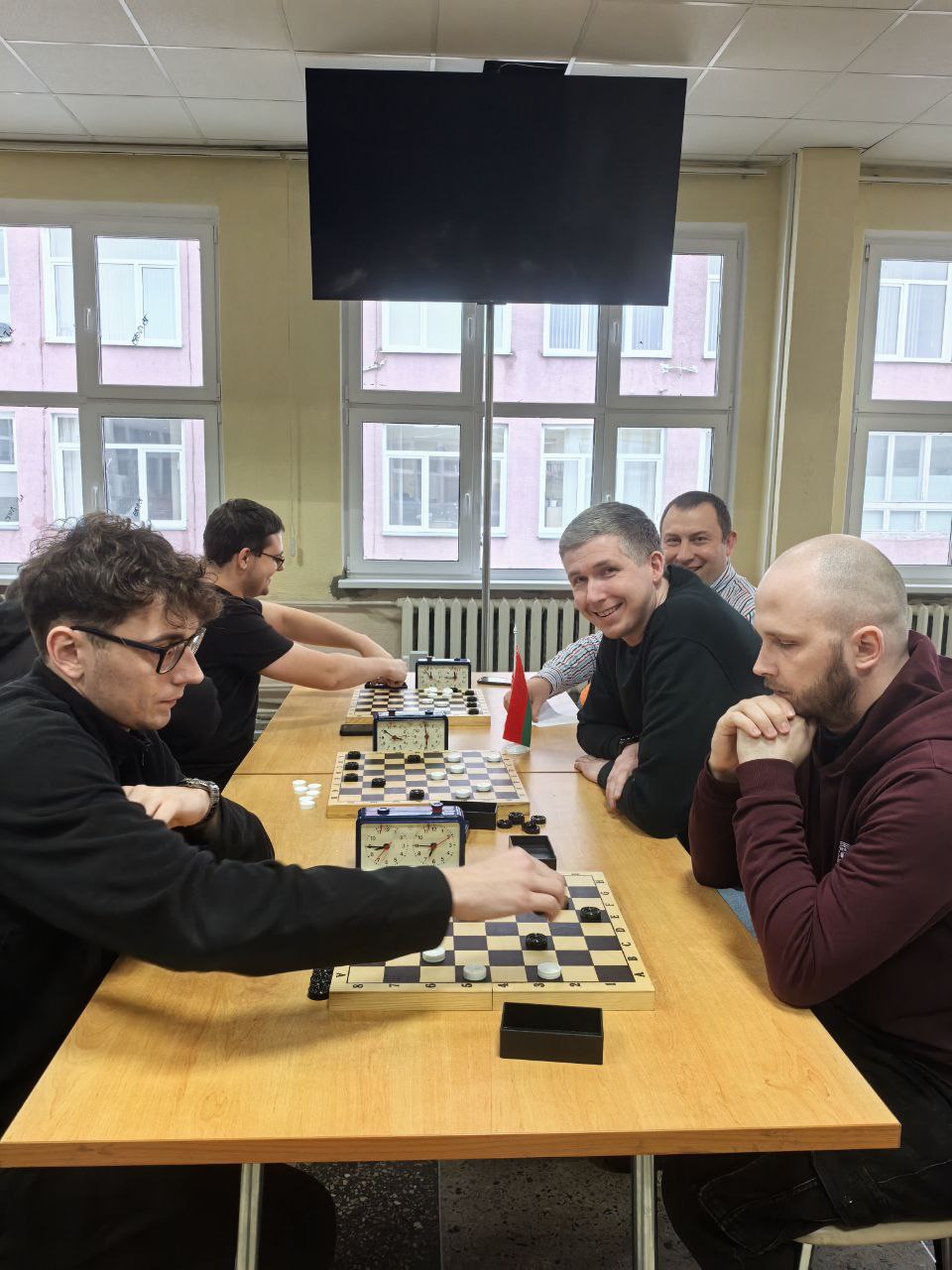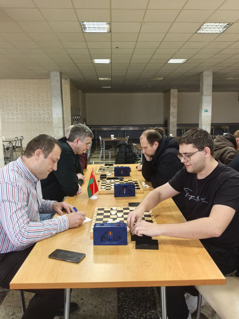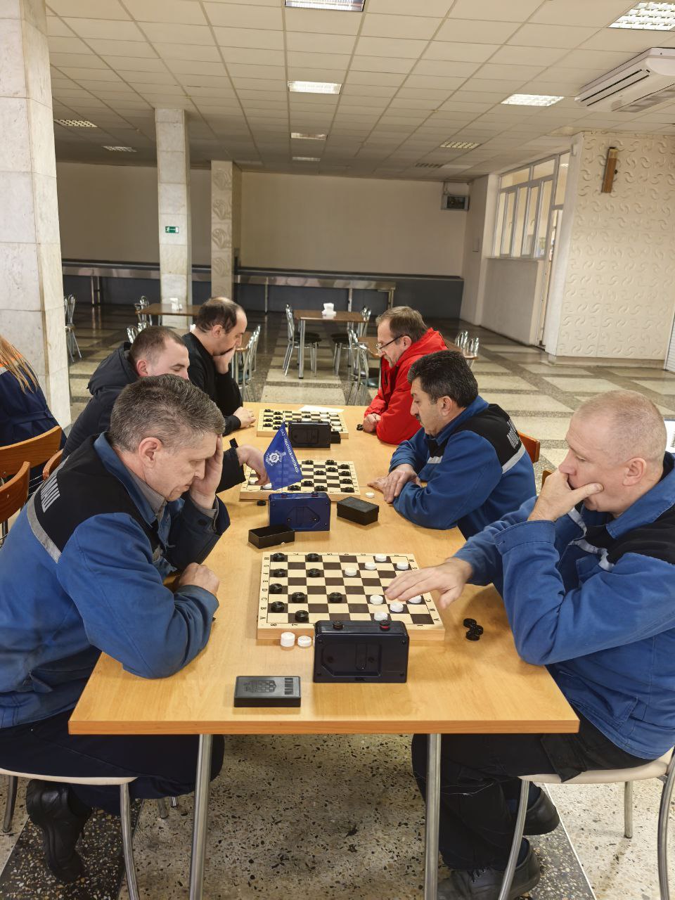 За шашечными досками царила сосредоточенность, но при этом чувствовалась теплая, дружественная атмосфера, объединяющая коллег.
